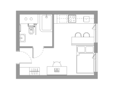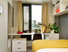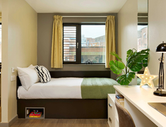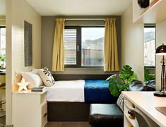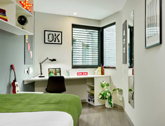 房型分为ensuite和studio两种,ensuite为4-10人间,均配置了独立卫浴和私人学习空间,每套flat的厨房配置烤箱,微波炉和烤箱,满足日常所需;studio面积16-22平,且租金全部包含水电wifi账单。