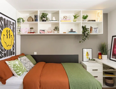 房型为ensuite和studio两种,全配置落地窗结构。ensuite面积14-16平,3-5人的Flat超有社交氛围;studio面积14-23平,私密性极高。每间卧室都配备有独立的卫生间和干湿分离的浴室,且床下储物空间超大,可以塞下行李箱,完全不占自由活动空间~