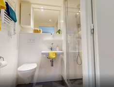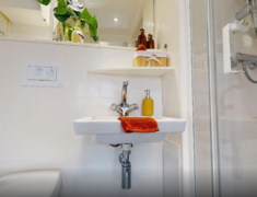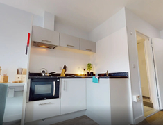公寓所有房间均提供独立卫浴,包括了马桶,半身镜,毛巾架,干湿分离淋浴间以及盥洗池等,卧室部分配备了双人尺寸1.37m*1.9m的双人床,床下储物柜,可存放两只托运行李箱,以及双开门衣橱,以及书桌椅,书柜,床头柜等家居。独立厨房包含了炉灶,油烟机,冰箱,烤箱,水槽,储物柜等。